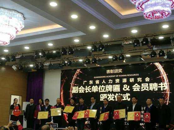会上举行了授牌仪式,广东技术师范学院天河学院被授予广东省人力资源研究会副会长单位,曾建权教授被聘为广东省人力资源研究会副会长并作为代表接受了副会长单位牌匾和聘书。