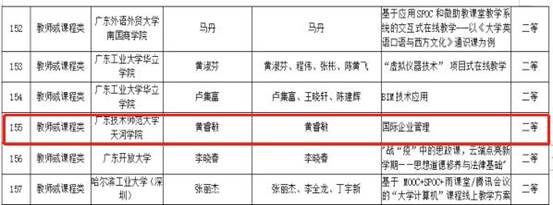 2月21日至4月9日期间,广东省本科高校在线开放课程指导委员会连续开展两批疫情阶段在线教学优秀案例评选活动,累计收到45所高校的1528份案例,其中亦包括“战疫英雄”钟南山院士团队申报的两份优秀案例。我校suncitygroup太阳集团黄睿敏老师的《国际企业管理》课程荣获二等奖。