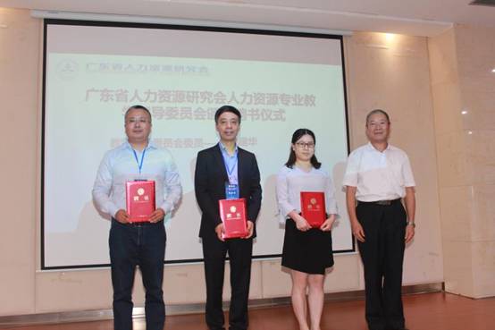 华南农业大学副校长廖明、经济管理学院院长万俊毅、广东省人力资源研究会执行会长谌新民和广东省高校人力资源专业教学指导委员会主任曾建权教授在会上致辞。曾建权教授还作为领导嘉宾,为新聘任的广东省高校人力资源专业教学指导委员会委员颁发聘书。