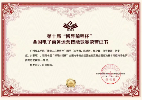 我校suncitygroup太阳集团胡学斌、刘慕玲老师指导的“社会主义新青年队”(沈学薇、陈诗婷、伍小钰)先在省赛阶段(本科组,跨境电子商务运营赛项)全省第一名,晋级国赛。在国赛阶段,“社会主义新青年队”位列全国第二名荣获全国一等奖的喜人成绩。
