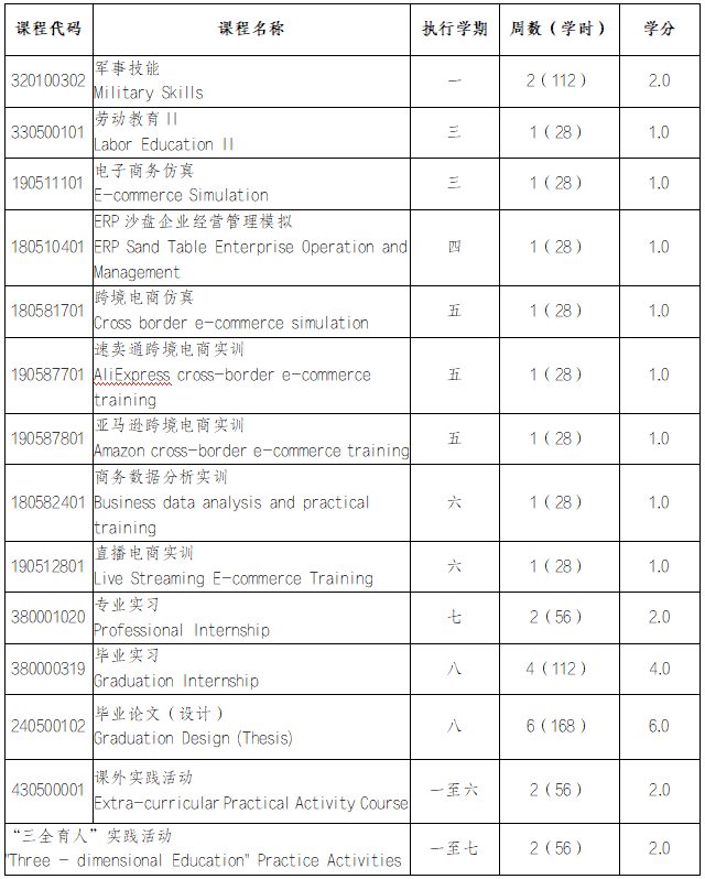 主要的专业实验/实训:电子商务课程实训、ERP 沙盘企业经营管理模拟、跨境电子商务课程实训、商务数据分析实训、直播电商实训、专业实习、毕业实习、毕业论文等。