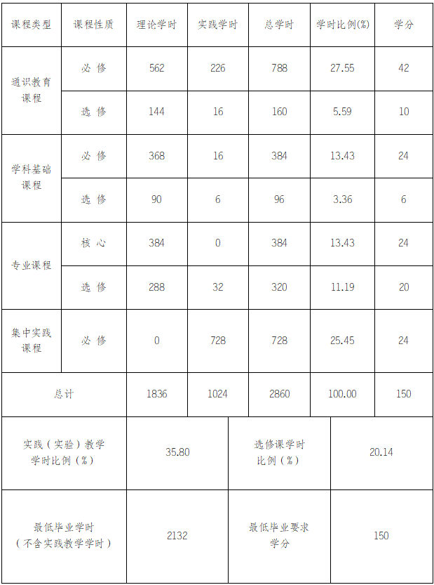 (二)毕业学分:本专业要求最低修满150学分,学生完成人才培养方案规定课程,修满规定的学分,符合德、智、体、美、劳全面发展的基本要求,准予毕业。