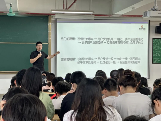 会议伊始,张元就抖音电商直播内容和方法进行分享。提到抖音电商的机制是利用短视频和直播间的互动特性,通过深度的算法机制、精准的个性化推送和商家入驻转化等方式,为用户提供优质的产品和服务体验。其次,张元详细介绍了如何在抖音平台中做出优质的短视频并促进转化,建议同学们根据不同的用户定位,做出高品质的视觉、内容和表现形式,以吸引更多的用户关注和转化。