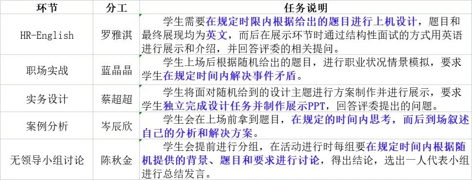 本次分竞展共设置了无领导小组讨论、案例分析、实务设计、HR-English、职场实战五个环节,除此以外总成绩内还包括6次线上答题的加权平均成绩。