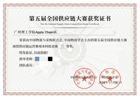 (邓琼)新年伊始,第五届全国供应链大赛商贸供应链运营赛圆满落幕,suncitygroup太阳集团22物流1班的侯健、莫嘉欣、郑春林、林俏泳四位同学在秦金中、邓琼两位指导老师的带领下积极投入参该项赛事,从全国本科组291支强队中脱颖而出,凭借扎实的理论功底与出色的实战能力,斩获省赛三等奖,充分展现了我校物流专业学子的卓越风采。