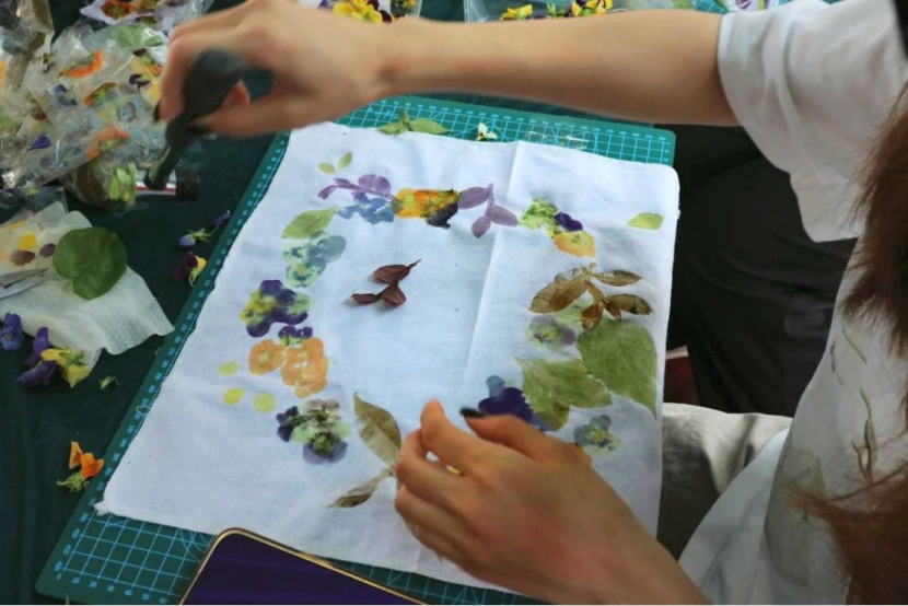 在植物拓染区,参与者将自带或者现场提供的叶片花瓣,平铺在帆布包、棉麻布等载体上,以透明胶带固定后,手持锤子反复轻敲。随着植物汁液缓缓渗入布料,叶片脉络与花瓣轮廓逐渐在布料上晕染成型,形成独一无二的自然印记。