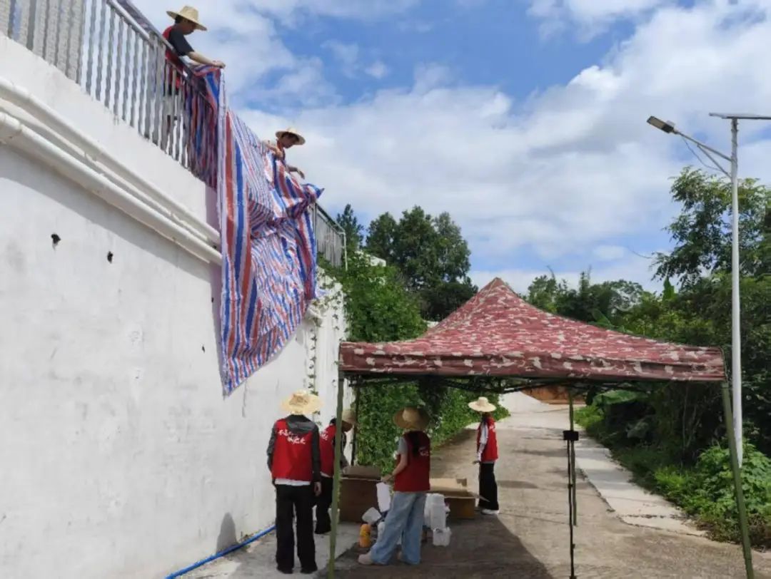 研讨结束后,队员们携带工具来到待绘墙面下,用卷尺精准丈量尺寸,以粉笔勾勒框架。傍晚整理颜料时,零星雨点悄然飘落,大家迅速用防水布遮盖物资,在细密雨丝中有条不紊地完成前期筹备,为次日绘画做好万全准备。