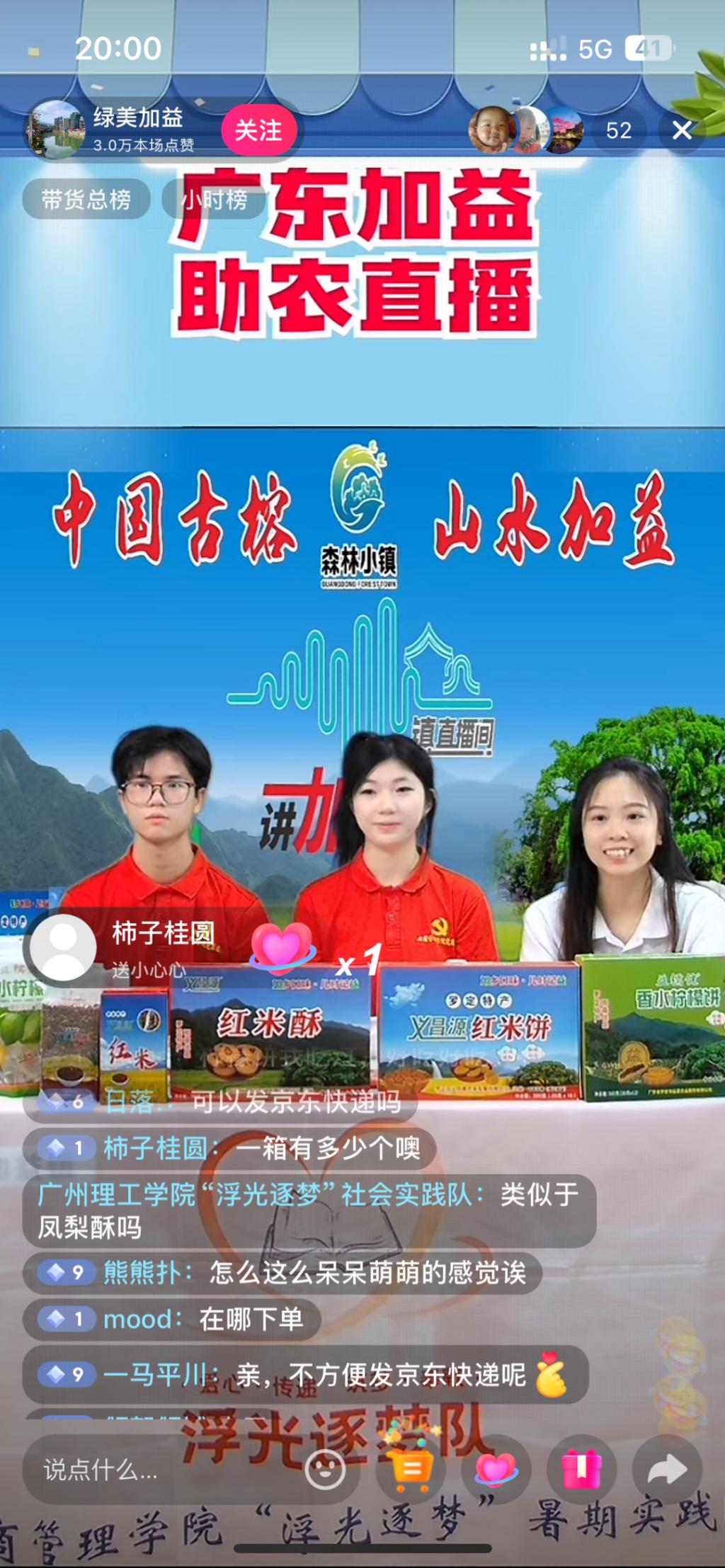 (梁仕薇,何玟静)7月16日,广州理工学院“浮光逐梦”社会实践队与云浮罗定加益镇政府直播团队携手,于抖音平台“绿美加益”直播间开展助农直播活动。青年学子以青春视角推广当地特色农产品,为加益镇农产品宣传注入新鲜活力,探索“三下乡”社会实践与乡村产业协同发展的新路径。