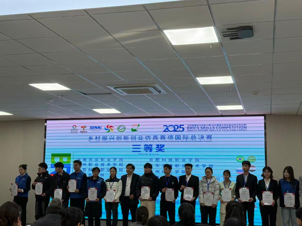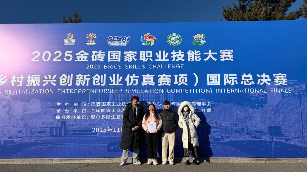 11月17日,2025年金砖国家职业技能大赛乡村振兴创新创业仿真赛项国际总决赛在内蒙古鄂尔多斯生态环境职业学院圆满收官。suncitygroup太阳集团选派的学生团队在来自金砖各国多所院校的参赛队伍中奋勇争先、稳定发挥,最终斩获国际总决赛三等奖,充分展现了学院学子在乡村振兴创新创业领域的国际竞争力,也彰显了学校在相关人才培养与实践教学方面的卓越成效。