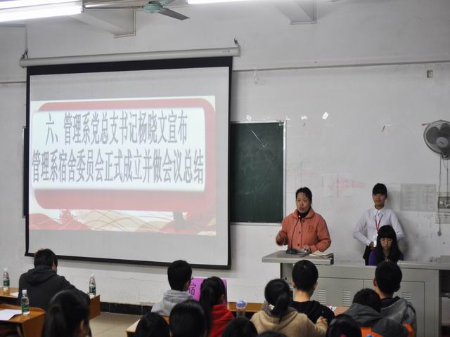 杨晓文书记为本次会议做了总结,她特意列举了有关宿舍安全卫生问题的实例,生动地说明了宿舍对全体学生的重要性,提出了对宿委会成员及我系全体学生的期望,赢得了同学们热烈的掌声。最后,在一片掌声之中,杨书记宣布管理系宿舍委员会正式成立。
