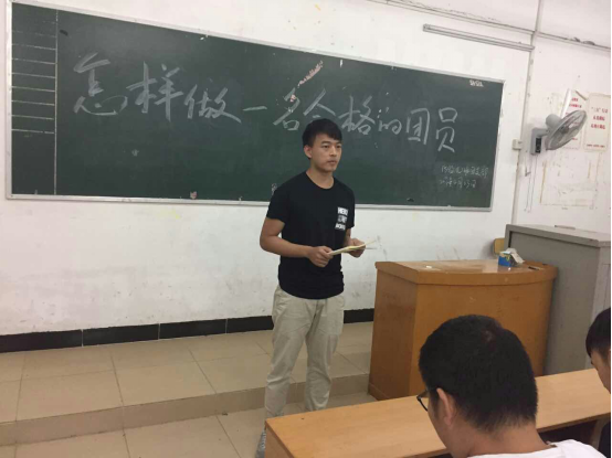 接着,他从团员自身出发,分四个点阐述了团员应该如何践行“学习总书记讲话,做一个合格共青团员”。在思想上,要拥护党的纲领,遵守党的章程,履行团员义务,尽量做到与党性保持高度一致;在政治上,坚决服从上级要求,深入学习“一学一做”主题教育实践活动,树立坚定理想,提高政治觉悟性;在行动上,做到遵纪守法,其中包括国家的法律、团的纪律和学校规章制度,并且要努力完成组织交代的任务;自觉参与志愿服务,在平常工作学习中,必须严于律己,努力自省,学会自我审视和批评。