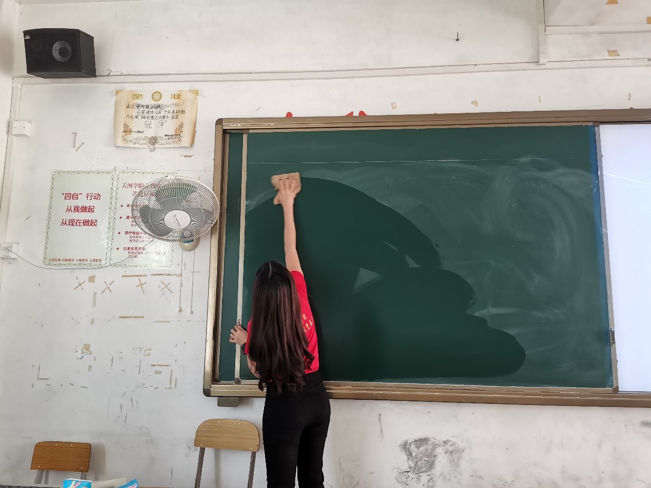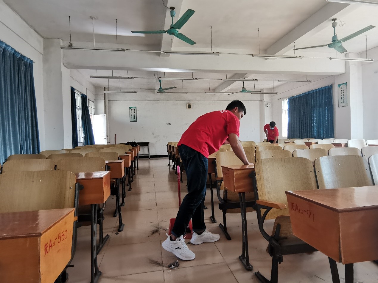 下午3点,党员同志们于6栋咨询台集合完毕。黄远鹤同志进行简单的注意事项说明和教室清洁人员安排之后,同志们来到各自被分配到的教室,有序开展清洁工作。党员同志们积极投身于其中,两人一组分工合作,秉持精益求精的精神,有序地进行课室清洁,不放过室内的每一个角落。党员同志们干劲十足,充分发扬不怕脏、不怕累、不怕苦、艰苦奋斗的精神,以劳动为荣,乐在其中。通过大家的努力,党员同志们一共打扫了20多间课室,教室面貌焕然一新,为我院全体师生营造了一个洁净,舒适的校园环境。