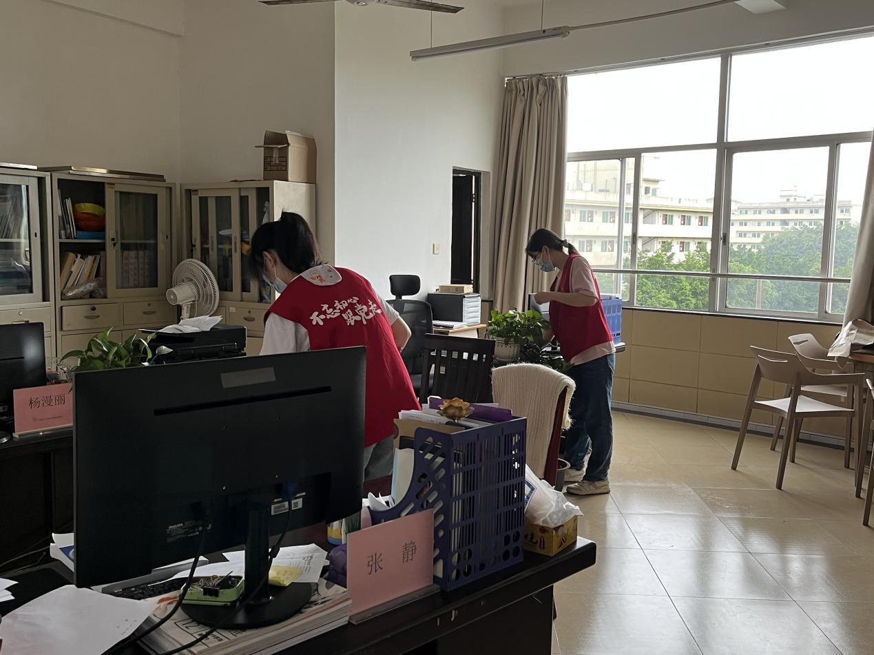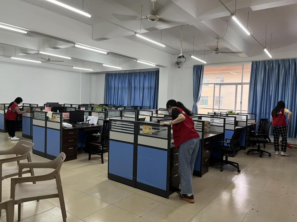 下午3点,志愿者们于6栋中庭集合完毕。刁凯聪同志进行简单的注意事项说明和清洁人员的安排后,志愿者们有序地去到各自被分配的办公室、校道进行清洁工作。