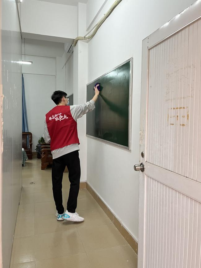 打扫办公室的志愿者们有序地拿到清洁工具,相互配合开展清洁活动。从黑板到办公桌再到地面,志愿者们不放过任何一个细节,认真地检查打扫,将老师平日工作的办公室整理得一尘不染。