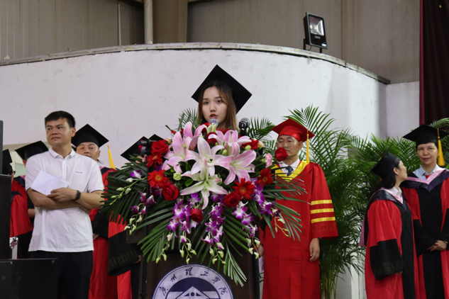 蔡婷洁作为毕业生代表发言,与全体毕业生一起分享了四年学习生涯的感悟,向学院、老师和全体毕业生寄予了美好的祝愿。她表示大学四年中最大的收获便是对未来的勇敢与坚定。毕业不意味着结束,而是全新的开始,要让每一次进步都更接近目的地。