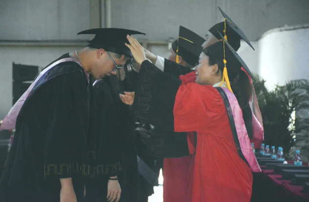 在悠扬的乐声中,毕业生有序上台,学院领导为毕业生颁发学位证书,逐一拨穗正冠。