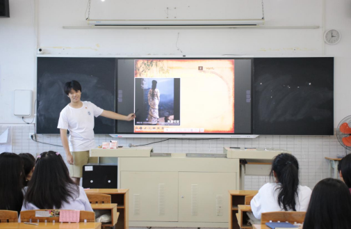 (侯健)7月12日14点30分,智“惠”未来社会实践队的成员陈逸杰在葵潭中学为向日葵班开展以中国传统文化为基调的趣味英语课程。本次趣味英语课程以中国传统文化为主体,将中国画、汉服和茶文化融入进课堂里,让小葵花们对如何用英语口语表述中国传统文化更加清晰,进一步提升自我的口语表达能力。