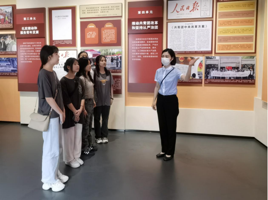 团一大纪念馆紧扣中国共产党领导下的中国社会主义青年团创建主题,展示了党亲手缔造共青团、指导共青团创建的历程。实践队跟随着讲解员,融入东园记忆,唤醒历史命脉,回顾五四运动爆发时,在党的领导下各地社会主义青年团的建立;学习中国社会主义青年团第一次全国代表大会潮起东园的故事,领会一代又一代青年在“党有号召,团有行动”的口令下不懈奋斗的精神。馆内展品丰富多样,珍贵的历史文物和照片真实地为我们展现英雄故事、青春故事、革命故事。