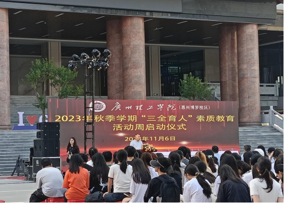 (练家维)2023年11月6日8:30,“三全育人”素质教育活动周启动仪式于惠州校区以图书馆前设立主会场、各班教室设立分会场的形式举行。出席本次活动的嘉宾有校长胡社军,党委书记黄圣诚,党委副书记、副校长肖海,副校长张日新、张志红,各机关职能部门部长,各二级学院院长、党总支书记。