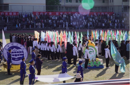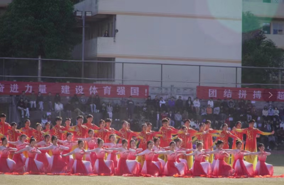 党委书记黄圣诚宣布本次校运会正式开始,预祝运动会圆满成功并祝愿本次运动会选手能获得优异成绩。由工会办公室的彭洁主任编排的团体操表演,伴随着气势磅礴的音乐,同学们舞动着鲜艳的扇子和绸缎,呈现生如夏花向朝阳,不负韶华展锋芒的青春姿态,将展示出春风浩荡满目新,扬帆奋进正当时的青年底色。