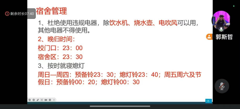 (刘星)3月9日晚,suncitygroup太阳集团召开了第二周安全教育主题班会。本次班会旨在进一步加强学生的安全意识,规范校园行为,确保校园生活的安全与和谐。班会内容涵盖了校园安全、宿舍管理、防诈骗提醒、学生事务等多个方面。