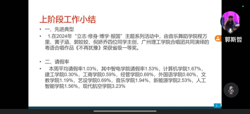 班会伊始,各班主讲人强调了班会考勤的重要性,要求各班严格记录未参会学生的名单、原因及去向。对于请假的学生,学院将在晚查寝时再次确认其是否返校。无故缺席的学生将按照《学生班会制度》及《学生考勤及请假管理办法》进行处理。