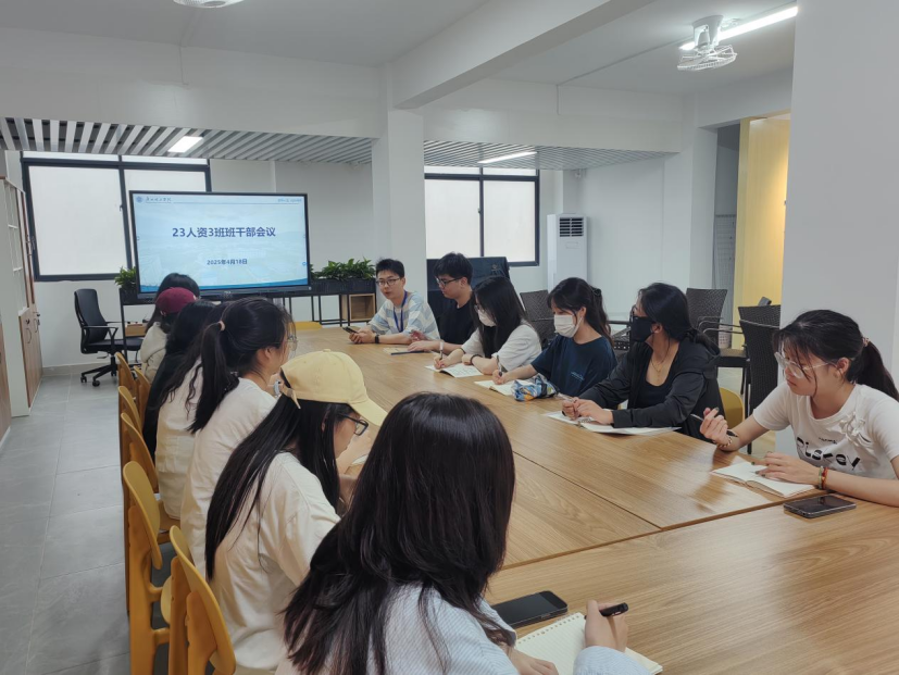 为进一步提升班级管理水平,营造良好的学风和班风,4月18日下午三点,23人资3班班委在第一社区召开班干部例会。本次会议由辅导员薛礼兴主持,全体班干部积极参加。