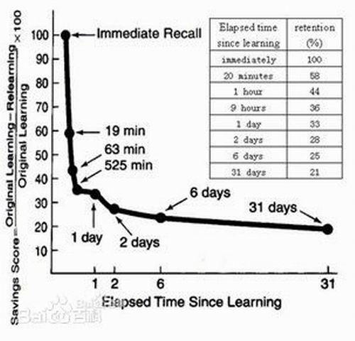 人的大脑是一个记忆的宝库,人脑经历过的事物,思考过的问题,体验过的情感和情绪,练习过的动作,都可以成为人们记忆的内容。例如英文的学习中单词、短语和句子,甚至文章的内容都是通过记忆完成的。从"记"到"忆"是有个过程的,这其中包括了识记、保持、再认和回忆。有很多人在学习英语的过程中,只注重了学习当时的记忆效果,孰不知,要想做好学习的记忆工作,是要下一番工夫的,单纯的注重当时的记忆效果,而忽视了后期的保持和再认,同样是达不到良好的效果的。要达到牢记,首先要了解遗忘曲线。