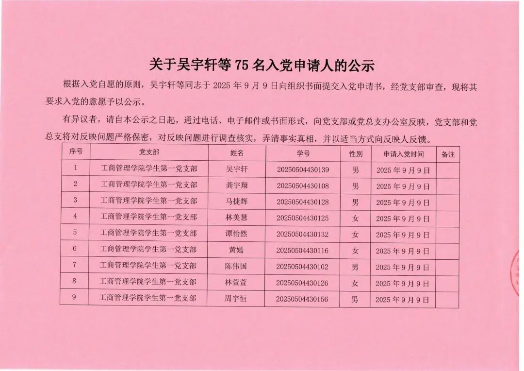 根据入党自愿的原则,吴宇轩等同志于2025年9月9日向组织书面提交入党申请书,经党支部审查,现将其要求入党的意愿予以公示。