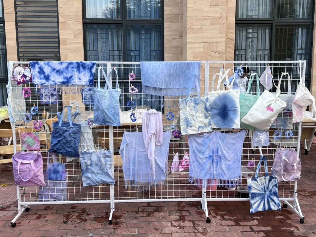 当日光衔着暖意渐斜,桌上的扎染作品整齐铺展,恍若一片流动的“色彩秘境”。每一件作品都带着手工制作的温度,在光线里漾开非遗技艺的灵动,皆是创作者独有的巧思。