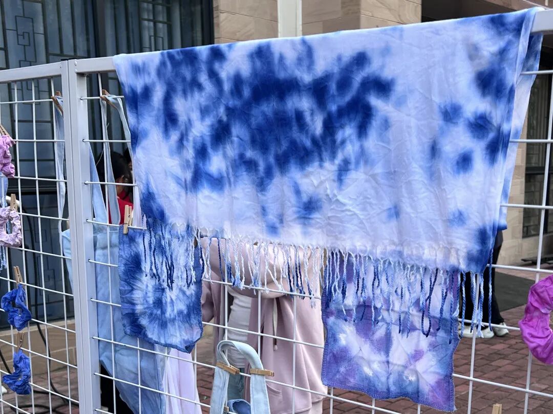 染色环节是整场活动的高光时刻。捆扎好的布料浸入染缸,素白从边角开始被色彩浸润,浅蓝渐变成靛青,淡紫晕出层次感。轻翻布料,任色彩在褶皱间流淌,勾勒出无规则却鲜活的纹路。阳光洒在染缸涟漪上,也映亮众人眼中的惊喜,每一件作品都成为独一无二的秋日印记。