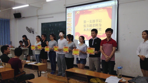 在演讲选手们激昂的演讲后进行了党的群众路线理论知识有奖问答互动环节。现场观众都踊跃参加,举手抢答,气氛相当活跃。问答环节之后,学生第一党支部书记张方超为优秀党日活动标兵颁奖,并与获奖的选手合影留念,整晚活动气氛达到了高潮。