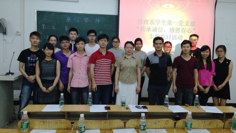 本系讯(通讯员:杨培琪)5月14日晚上7点30分在六栋416我系学生第一党支部开展“传承诚信、感恩存心”主题党日活动。到场的嘉宾有我系党总支书记杨晓文,学生第一党支部书记张方超,学生第二党支部书记林成园以及学生第三党支部书记秦文飞。