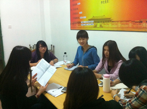管理系学生党员工作站与学生党支部的党员在制作活动横幅