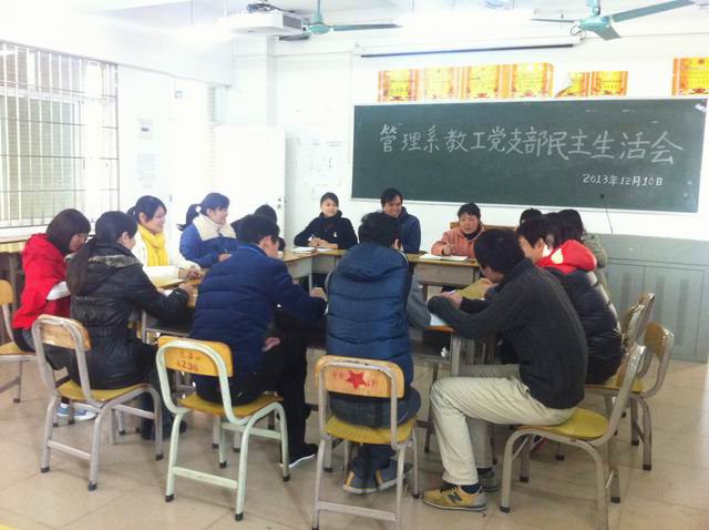 本系讯(通讯员:林成园)12月10日,管理系在六栋309召开了教工党支部民主生活会。本次民主生活会的主题是“贯彻学院文件精神,全面提高教工党员党性修养”,进行了教工党员的批评与自我批评。会议由我系党总支书记杨晓文主持,全体教工党员参加了会议。