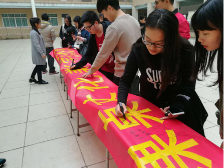 随后,在6栋中庭开张“清除课桌文化,美化学习环境 ”主题横幅签名活动,同学们在横幅上留下了真诚的心意。希望通过此举可以让同学们把我们本次活动的目的牢记于心。