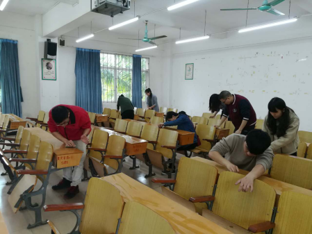 活动开始,首先对6栋303A、303B课室桌面乱涂乱画的“课桌文化”进行清理。“课桌文化”是一种陋习、不文明行为。通过以6栋303A、303B课室为试点,向同学们传达清除课桌文化、爱护公共财产、美化学习环境的信号。
