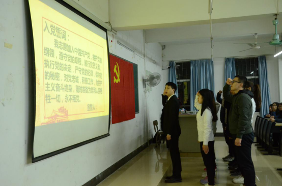 伴随着激昂的中华人民共和国国歌的响起,会议正式拉开帷幕。梁国栋同志带领29期发展对象进行入党宣誓;随后观看2017年度总结视频,紧跟着2017年度支委代表陈涛同志发言,进行年度工作汇报;陈涛同志总结一年来我们提高自身素质、扩大学生党员在学生中的影响;积极开展活动,加强交流,提高普通学生对党的认识。