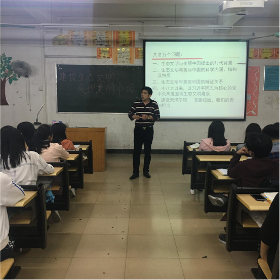 3月29日晚,为了进一步加强大学生思想政治教育工作,贯彻落实党的十九大精神,我院党总支书记易国富在6栋215为17级电子商务专业的学生讲授主题为《建设生态文明,实现美丽中国》的书记一课。