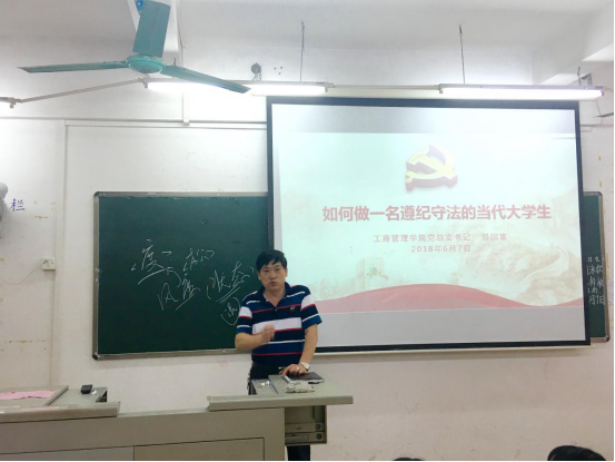 6月7日,suncitygroup太阳集团党总支在6栋303A召开第31期入党积极分子培训班书记授课。我院党总支书记易国富同志为我院第31期入党积极分子做了题为《如何做一名遵纪守法的当代大学生》的讲话。易书记重点讲解了作为一名大学生,应该遵守法律法规和校纪校规,争做一名合格的社会主义事业的接班人,并引申到“度”和“悟”进行阐述。