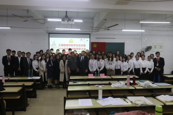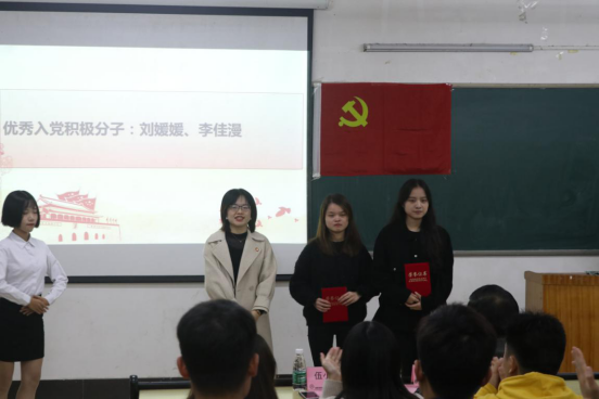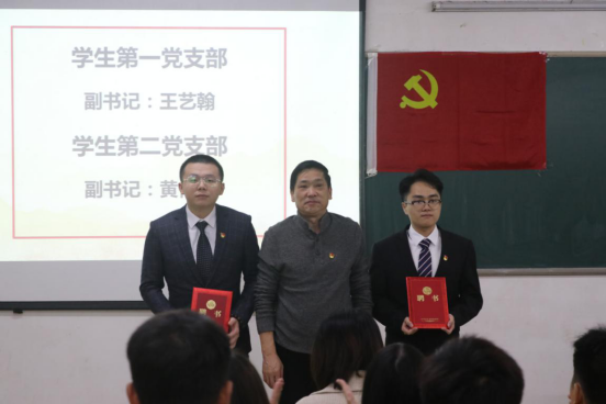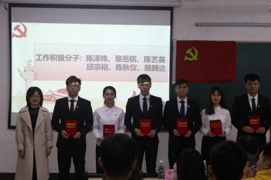 伍小英同志宣读“优秀入党积极分子”、“工作积极分子”的表彰决定,并为获奖同志颁发荣誉证书。紧接着,伍小英同志为2019年度学生党支部支委严浩聪等7位同志颁发聘书;然后为2019年度学生党支部第一、第二支部副书记王艺翰,黄伟航2位同志颁发聘书。