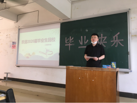 接着,肖振华副院长首先代表学院全体教职工向2020届返校毕业生表示热烈的欢迎,同时要求同学们在校期间一定要积极配合学校做好疫情防控工作,顺利离校。肖院长强调同学们作为应届毕业生,即将正式踏入社会,社会的竞争是激烈的,是残酷的,但是逆风的方向,更适合飞翔,是同学们大施身手,一展宏图的时候。希望同学们好好努力、好好奋斗,展现新时代青年风貌,在社会上发光发热,传递出新一代青年人身上的正能量与家国情怀,以勇担使命的行动争当岗位先锋,母校将以同学们为荣。