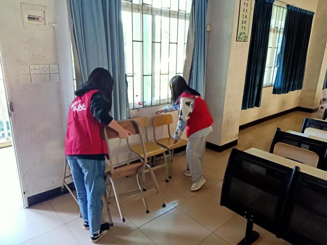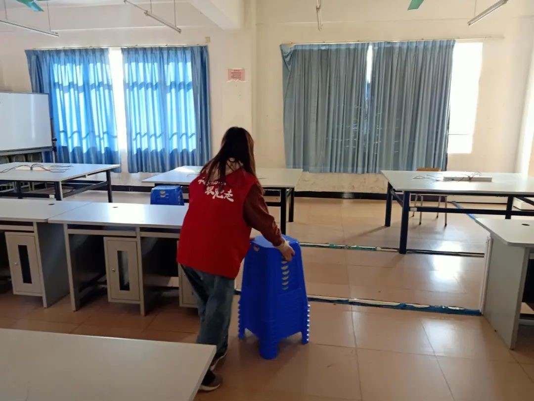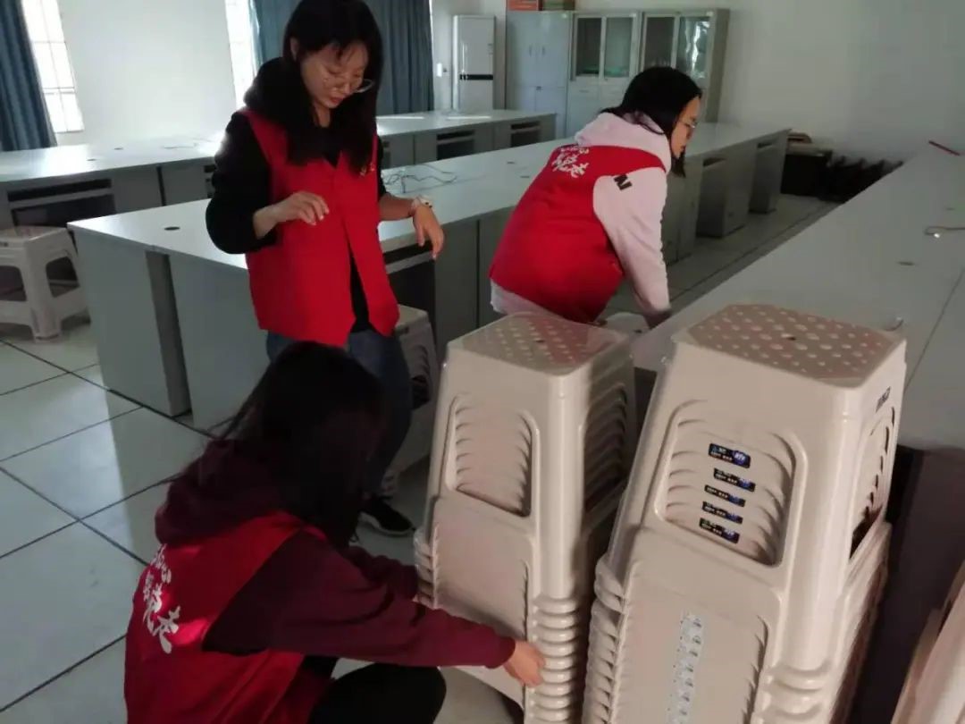 积极分子们积极投入其中,在党员同志的指挥下,将实验室中的木质板凳和靠凳全部进行转移,并对室内的胶椅进行了合理的位置摆放,整齐划一、井然有序,呈现出了一间间简洁的实验室环境。在转移搬运的过程中,同志们分工明确、团结合作,在保证安静、上课秩序的前提下,快速高效地将凳子进行转移。