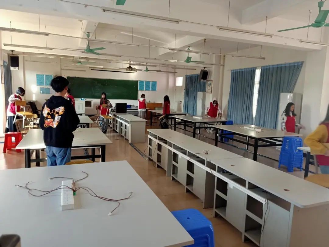 为充分妥善地利用教学物资,经过合理的分配,将转移出的凳子平均分配在每间课室,为课室的机动位置做了及时的补充,并将课室内的可动桌椅进行了整齐的摆放,营造了整齐大方、简洁规范的教室环境,同志们还简单整理清洁了讲台和多媒体平台,将物品摆放整齐、井井有条。经过一小时的努力,此次课室清理活动顺利完成。