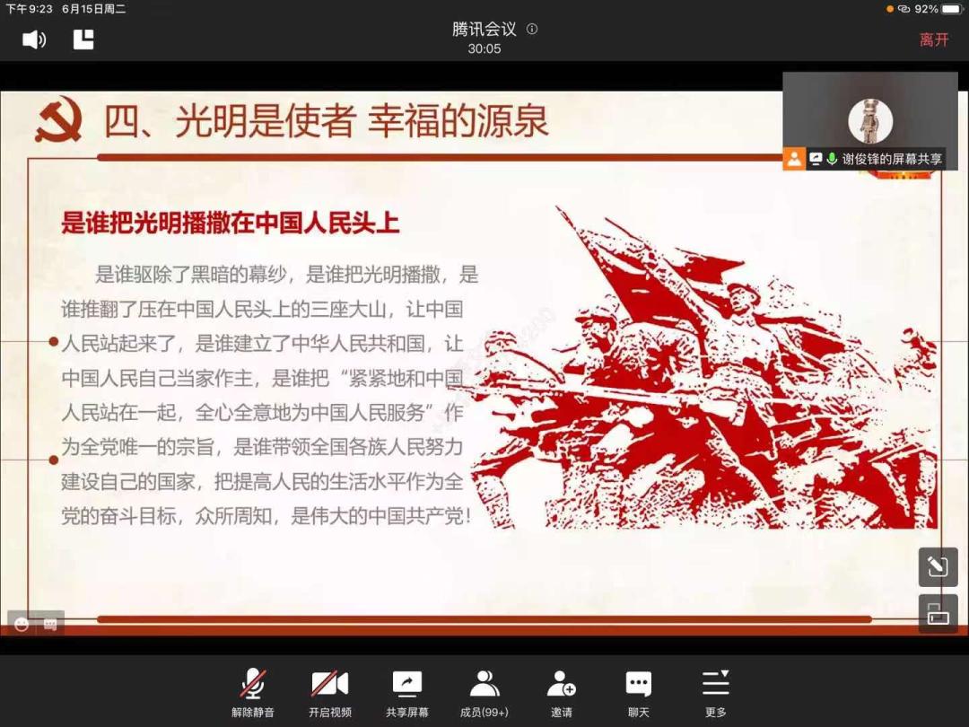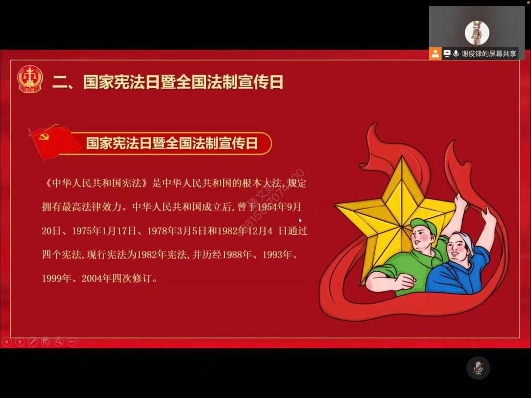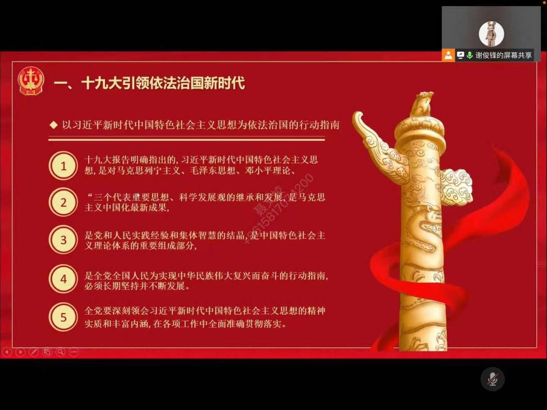 为深入学习贯彻习近平法治思想认真贯彻落实党中央关于推进法治中国和法治社会建设,进一步推进学校法治教育、安全教育落到实处、取得实效,不断增强我院学生的法治意识,提高我院学生法治素养,suncitygroup太阳集团党总支于2021年6月15日晚上21:00举行线上法治教育会议,我院在校学生党员按时参加了此次会议,会议主讲人由谢俊锋同志担任。