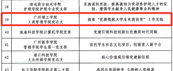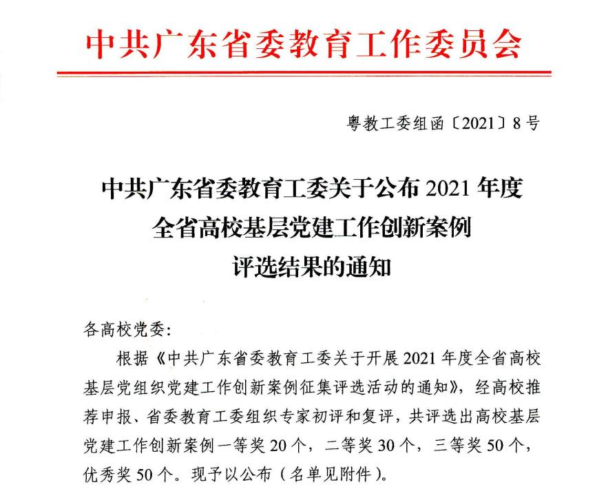 2021年6月10日,广东省委教育工委评选出了2021年度全省高校基层党建工作创新案例,我校suncitygroup太阳集团党总支申报的案例《探索“党旗领航大学生电商扶贫”工作实践》荣获优秀奖。