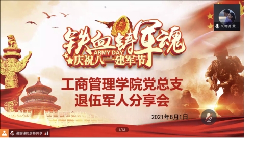2021年8月1日,是中国人民解放军建军94周年,suncitygroup太阳集团党总支于8月1日晚上19:00开展“军旅生涯分享会”,组织线上聆听退伍同志们的从军故事。我院刘威志老师、朱砂老师、方希璐老师和在校学生党员按时参加了此次会议,会议主讲人由谢俊锋同志和黄远鹤同志共同担任。总有着这么一群人站在祖国边疆地区保家卫国,默默奉献着;那群人就是——军人战士们,他们是边防线上那双炯炯有神的眼睛,是和平年代里的功臣,也是军旗上那颗最闪耀的星。