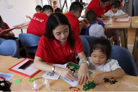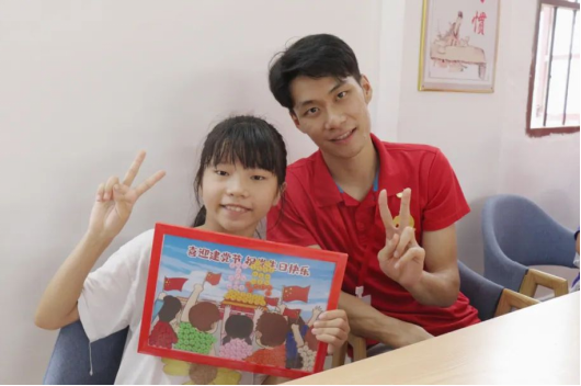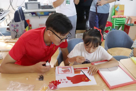 此外,我们还制作了一系列与中国共产党相关的手工纽扣贴画,小朋友们按照操作方式一步步把贴画贴好。“童心向党”、“我心向党”、“党在我心中”,“永远跟党走”,“热爱国家热爱党”、“红领巾心向党”贴画中的一句句红色标语在小小的课室回荡着,格外地动听,深入人心。经过这些生动有趣的课外活动,实践队队员和每一个孩子都露出了可爱灿烂的笑容。