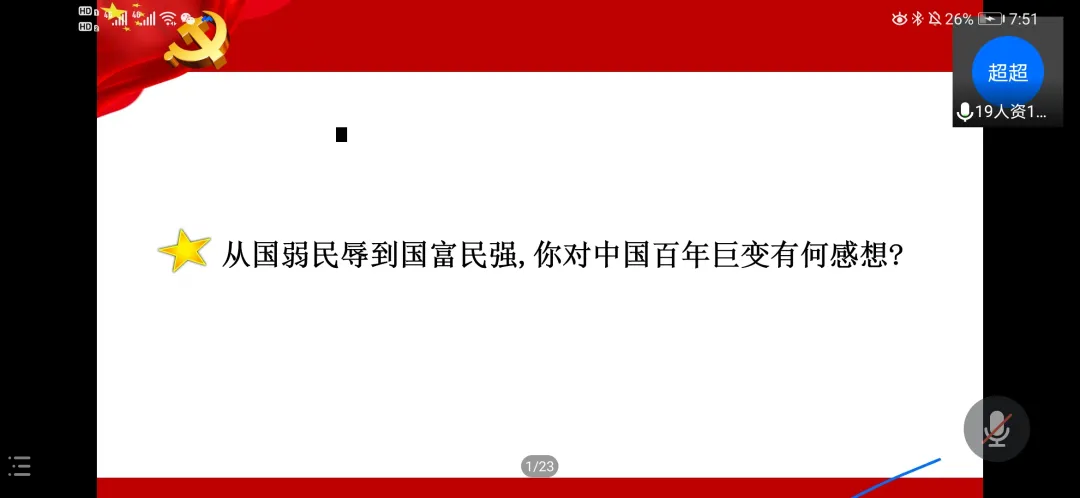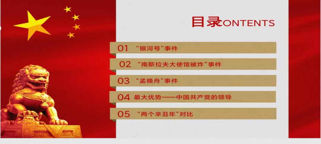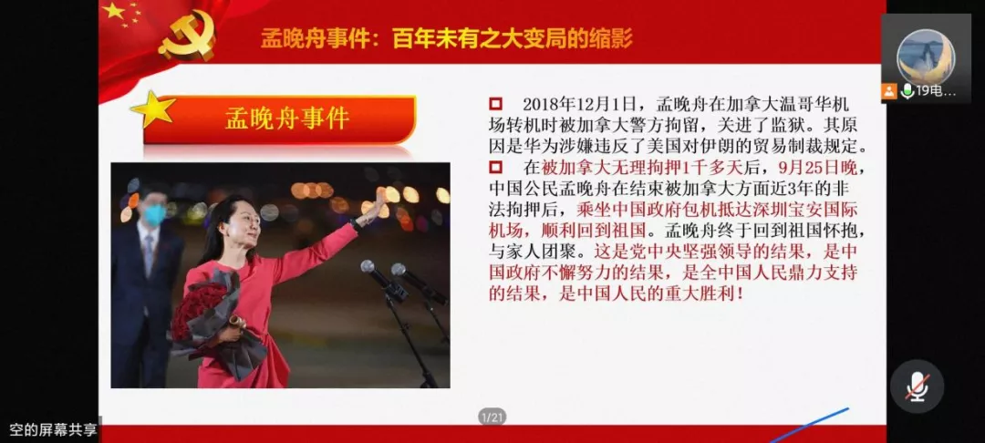 会议主要从“银河号”事件、“南斯拉夫大使馆被炸”事件、“孟晚舟”事件、最大优势——中国共产党的领导、“两个辛丑年”对比这五部分的内容展开学习。