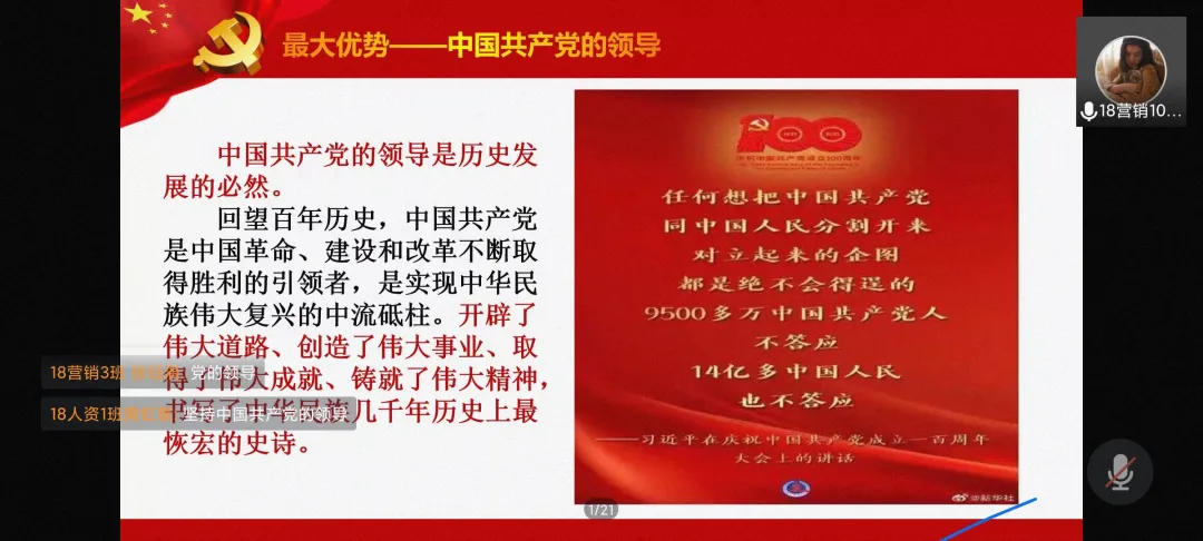 “两个辛丑年”对比,如今的中国早已经不是原来那个中国,在2021年中美高层战略对话中,中方字字铿锵有力,掷地有声,将中国人的志气,中国人的底气,中国人的力量都展现于世界。学生党员们在会议中积极分享了自己对于百年大党的真实感受:回首过去,学习红色精神;展望未来,要一直坚持中国共产党的领导。